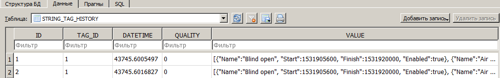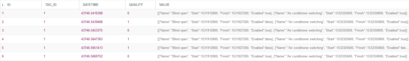 Thanks so it's not the case. I made more tests with your sample (only enabling/disabling schedules). Here is db records. Records on UI update changes are ok, but after restart string with defaults values are written. Most probably something within js code?