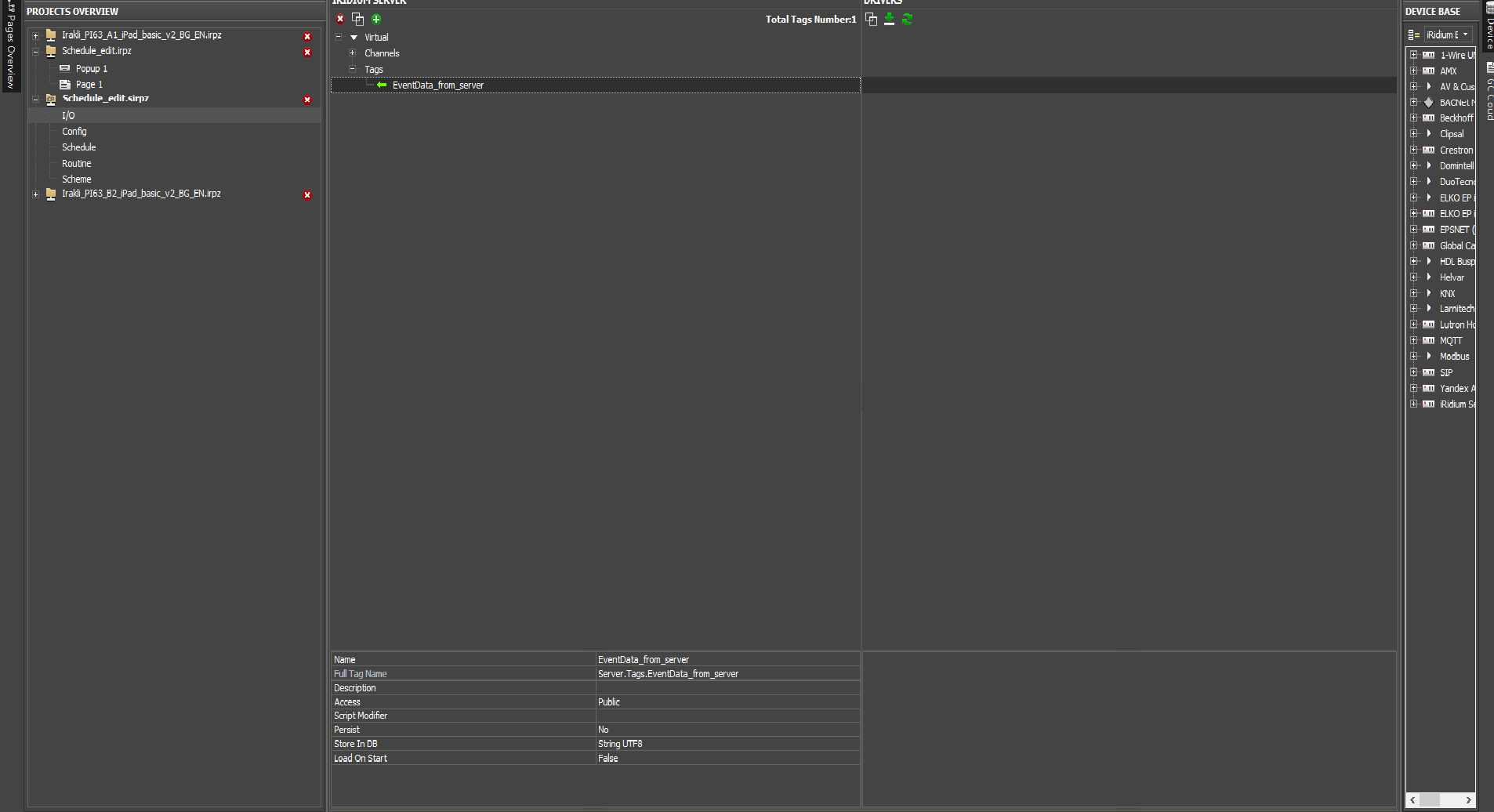 function clone(obj) { if (null == obj || "object" != typeof obj) return obj; var copy = obj.constructor(); for (var attr in obj) {//if (obj.hasOwnProperty(attr)) copy[attr] = obj[attr]; } return copy; } //IR.Log("ENUM " + createNewProperty); var schedule = IR.GetScheduler("Schedule 1"); // creating a string with schedule data var EventChanger = function() { var EventBuff = []; //function EventP() { } //MonkeyPathcing var EventProt = { //constructor: EventP, Name: undefined, // event name Start: undefined, // event start date-time End: undefined, // event finish date-time Enabled: undefined, Type: undefined, //Parent: undefined, Day: undefined, End: undefined, WeekDays: undefined, RepeatEnd: undefined, MonthRepeatType: undefined, MonthDays: undefined, DayNumber: undefined, WeekDay: undefined, StartSunType: undefined, //TODO: Sun Offset } //EventP.prototype=EventProt; /* var Event = function(inp) { this.Name; // event name this.Start; // event start date-time this.End; // event finish date-time this.Enabled; this.Type; this.Day; this.End; this.WeekDays; this.RepeatEnd; this.MonthRepeatType; this.MonthDays; this.DayNumber; this.WeekDay; this.StartSunType; //TODO: Sun Offset for (var inpn in inp) { this[inpn] = inp[inpn]; //if (inp.hasOwnProperty(inpn) && inp[inpn]!==undefined){ //IR.Log("add prop " + inpn.toString() + " = " + inp[inpn]); //this[inpn.toString()] = inp[inpn]; //} } } */ // writing schedule data in virtual tag this.Write = function(in_events) { EventBuff = []; for(i in in_events) { //.propertyIsEnumerable("Name")); //IR.Log ("PROTEIN " + in_events[i].__proto__); in_events[i].__proto__= EventProt; //for(j in in_events[i]) { // IR.Log("Enumerable " + j + " == " + in_events[i][j]); //} var d2 = clone(in_events[i]); //var NEvent = new Event(in_events[i]); EventBuff.push(d2); } var string = JSON.Stringify(EventBuff); IR.SetVariable("Server.Tags.EventData_from_server", string); } // reading schedule data in virtual tag this.Read = function(in_schedule, in_NewData) { EventEdit = in_schedule.GetEvent(in_NewData.Name); EventEdit.Start = Math.floor(new Date(in_NewData.Start)); EventEdit.End = Math.floor(new Date(in_NewData.End)); EventEdit.Enabled = (in_NewData.Enabled == 1); EventEdit.Done(); // event update } } var EventsObj = new EventChanger(); // getting schedule data at server start IR.AddListener(IR.EVENT_START,0,function() { var svdData = IR.GetVariable("Server.Tags.EventData_from_server"); var schedule = IR.GetScheduler("Schedule 1"); if (svdData) { IR.Log("SAVEVED DAta " + svdData); EventsObj.Read(schedule, JSON.Parse(svdData)); } else { events = schedule.GetEvents(); EventsObj.Write(events); } }); // getting new data from panel IR.SetGlobalListener(IR.EVENT_GLOBAL_TAG_CHANGE, function(in_sName, in_sValue) { var newData = JSON.Parse(in_sValue); EventsObj.Read(schedule, newData); events = schedule.GetEvents(); EventsObj.Write(events); }); // subscribing for tag changes IR.SubscribeTagChange("Server.Channels.EventData_to_server");Hello!