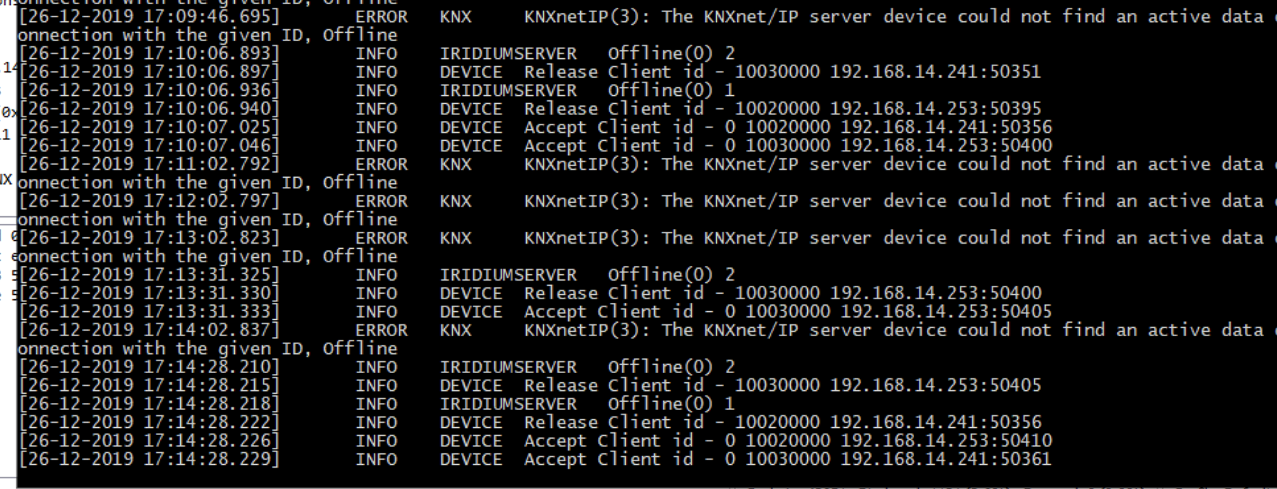 [15-11-2019 09:15:29.277] ERROR KNX KNXnetIP(4): The KNXnet/IP server device could not find an active data connection with the given ID, Offline